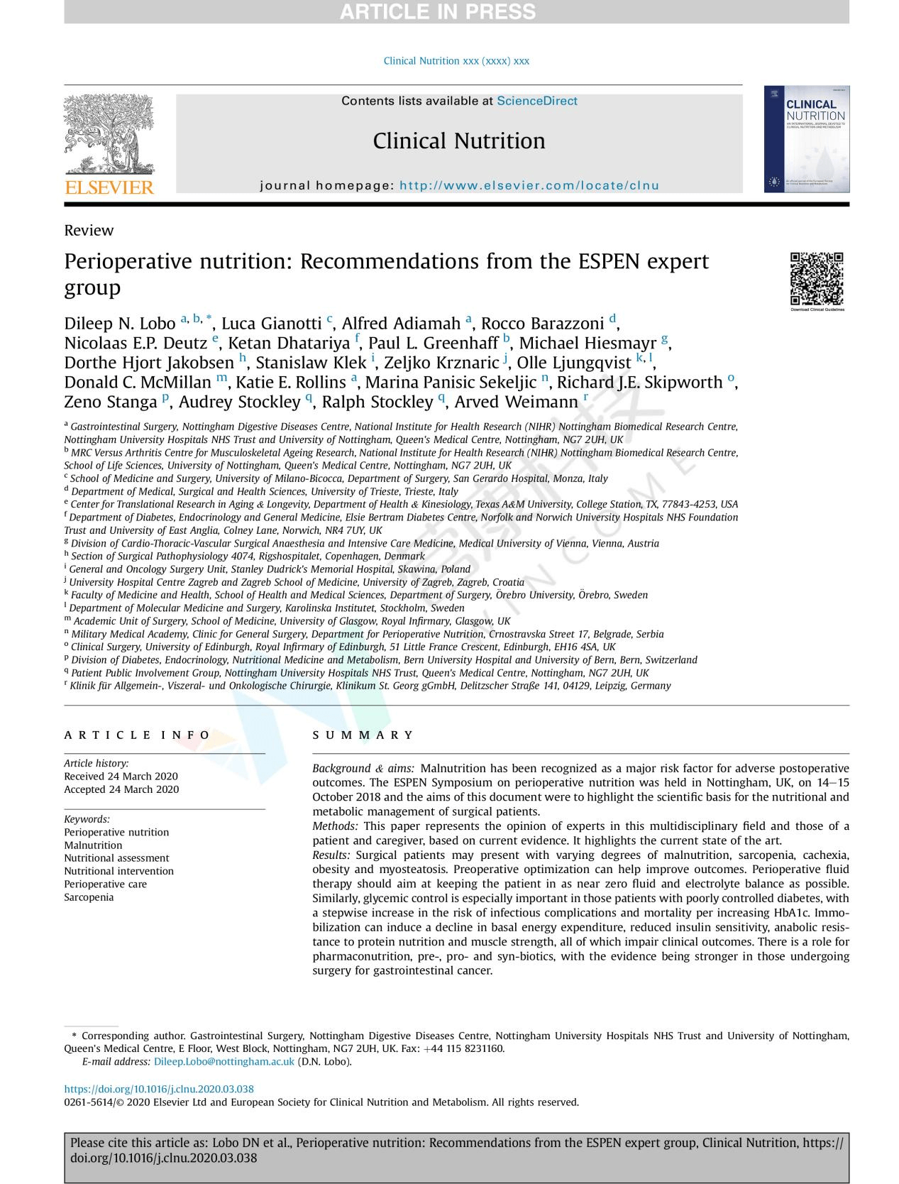 【3】中國2型糖尿病合并肥胖綜合管理專家共識[J].藥品評價,2016,13(17):5-10+12.Dileep N. Lobo,Luca Gianotti,Alfred Adiamah,Rocco Barazzoni,Nicolaas E.P. Deutz,Ketan Dhatariya,Paul L. Greenhaff,Michael Hiesmayr,Dorthe Hjort Jakobsen,Stanislaw Klek,Zeljko Krznaric,Olle Ljungqvist,Donald C. McMillan,Katie E. Rollins,Marina Panisic Sekeljic,Richard J.E. Skipworth,Zeno Stanga,Audrey Stockley,Ralph Stockley,Arved Weimann. Perioperative nutrition: Recommendations from the ESPEN expert group[J]. Clinical Nutrition,2020,39(prepublish).